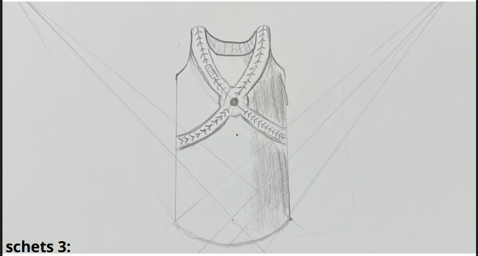 Ik maakte meerdere schetsen en werkte verschillende alternatieven uit voordat ik mijn definitieve ontwerp koos. Uiteindelijk bleek een mouwloos shirt de beste oplossing, omdat dit makkelijker onder normale kleding gedragen kan worden en daardoor prettiger is in het dagelijks gebruik. In het ontwerp verwerkte ik brede banden rond de borst en schouders, met een verwarmende functie om de schouders warm te houden en extra ondersteuning te geven aan de houding.